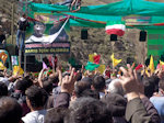 A Idil il Newroz, si festeggia tra strade polverose e case molto povere, a volte semplici baracche. Arriviamo nel piazzale dove si tengono le celebrazioni: dopo aver passato gli usuali filtri della polizia, aver avuto il consueto servizio fotografico da parte degli agenti dei servizi appostati sui tetti intenti a filmare e fotografare tutti. Possiamo finalmente immergerci nella gioia di questo nostro primo Newroz. Una festa molto militante, un piccolo grande mare di persone (circa 15000) dal quale spuntano a volte bandiere del PKK e piramidi umane di ragazzi intenti a innalzare gigantografie di Ocalan e altre icone del movimento kurdo; col volto coperto dalle keffie per non farsi riprendere dalla polizia , che potrebbe arrestarli in ogni istante. I colori vietati: rosso, verde e giallo inondano di luce la piazza polverosa.Il momento più toccante è il minuto di raccoglimento dedicato ai martiri: in un silenzio completo 15000 mani alzate con le dita a W quella lettera dell’alfabeto kurdo che non esiste in quello turco , che compone la parola NEWROZ, quella lettera insieme ad altre 4 che è vietato usare e che qui riempie il cielo , è sherildan , ribellione , lotta al tiranno , desiderio di libertà. Poi si accende il fuoco, fuoco di libertà, di speranza, di un nuovo giorno. Dal palco si alternano le autorità e i cantanti , la festa arriva al culmine , si fanno volare le colombe bianche in segno di pace e fratellanza. Anche noi saliamo sul palco, emozionati e contenti di condividere lo stesso desiderio di pace, libertà, rispetto delle diversità . Incrociamo storie grandi, immense di donne, anziani e bambini, storie di guerra e sofferenza, di violenza, tortura e carcere, storie di lotta che ti aprono la porta verso una grande possibilità di liberazione collettiva. Ci abbracciamo, balliamo insieme, ci perdiamo tra la gente che ci calca addosso la propria umanità , che non dovremo mai dimenticare, soprattutto al nostro ritorno. Alla fine della festa ci ritroviamo insieme ad una moltitudine di bambini, ragazze, donne che ci salutano per l’ultima volta.. chissà se domani qualcuno sarà arrestato , qualche bambino incarcerato.. questo è il pensiero di tutti noi mentre stringiamo mani, diamo baci e abbracci . A Idil il newroz è permesso da soli 5 anni , prima lo si festeggiava lo stesso , ma finiva in un bagno di sangue.